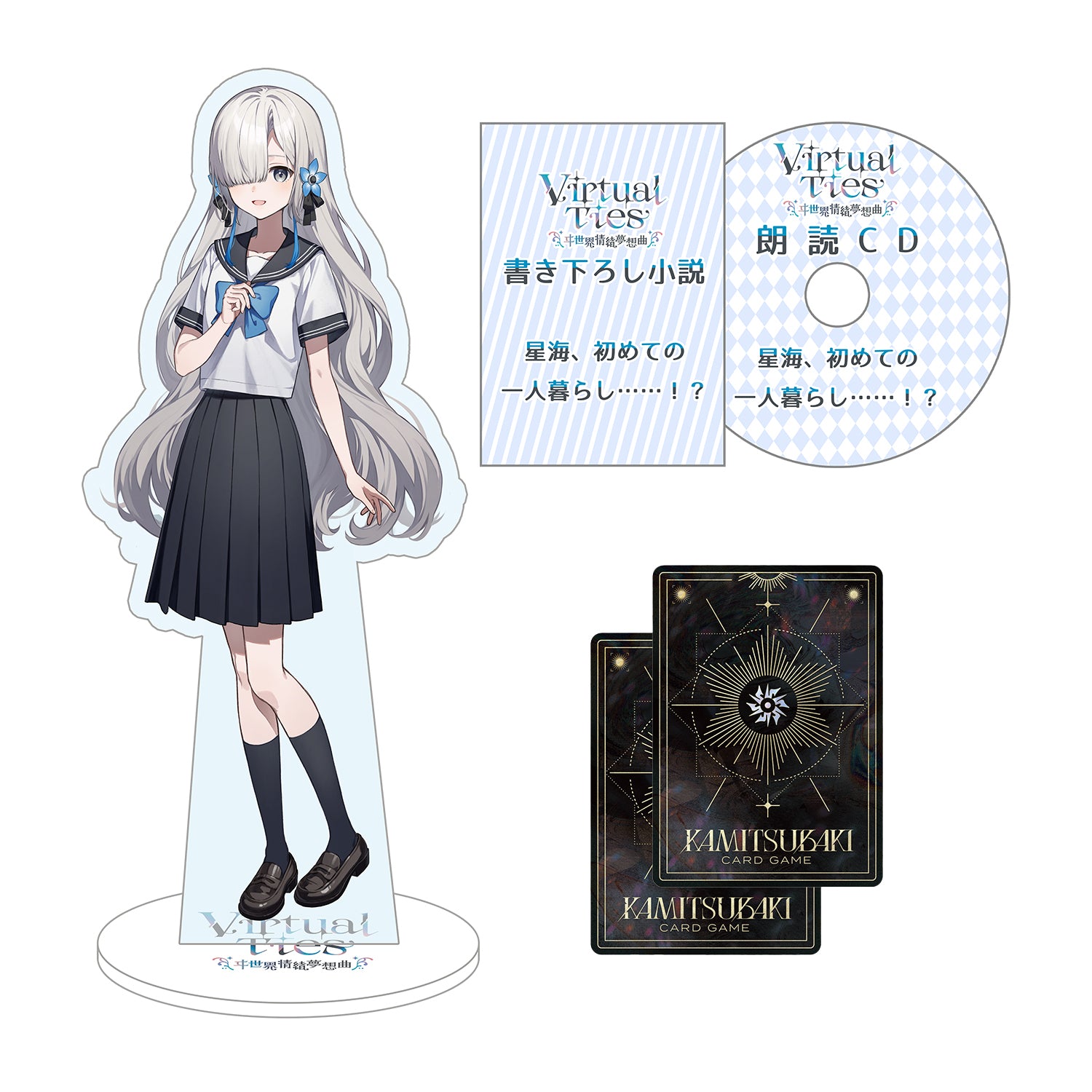 ゲームソフト(Switch)、B2タペストリー、アクリルスタンド(立ち絵)、書き下ろし小説、朗読CD、KAMITSUBAKI CARD GAME 特典カード・R/SR(各1枚)、アクリルパネル、書下ろしドラマCD、アート色紙、記念ライブアーカイブ視聴券、限定アフタートーク視聴券